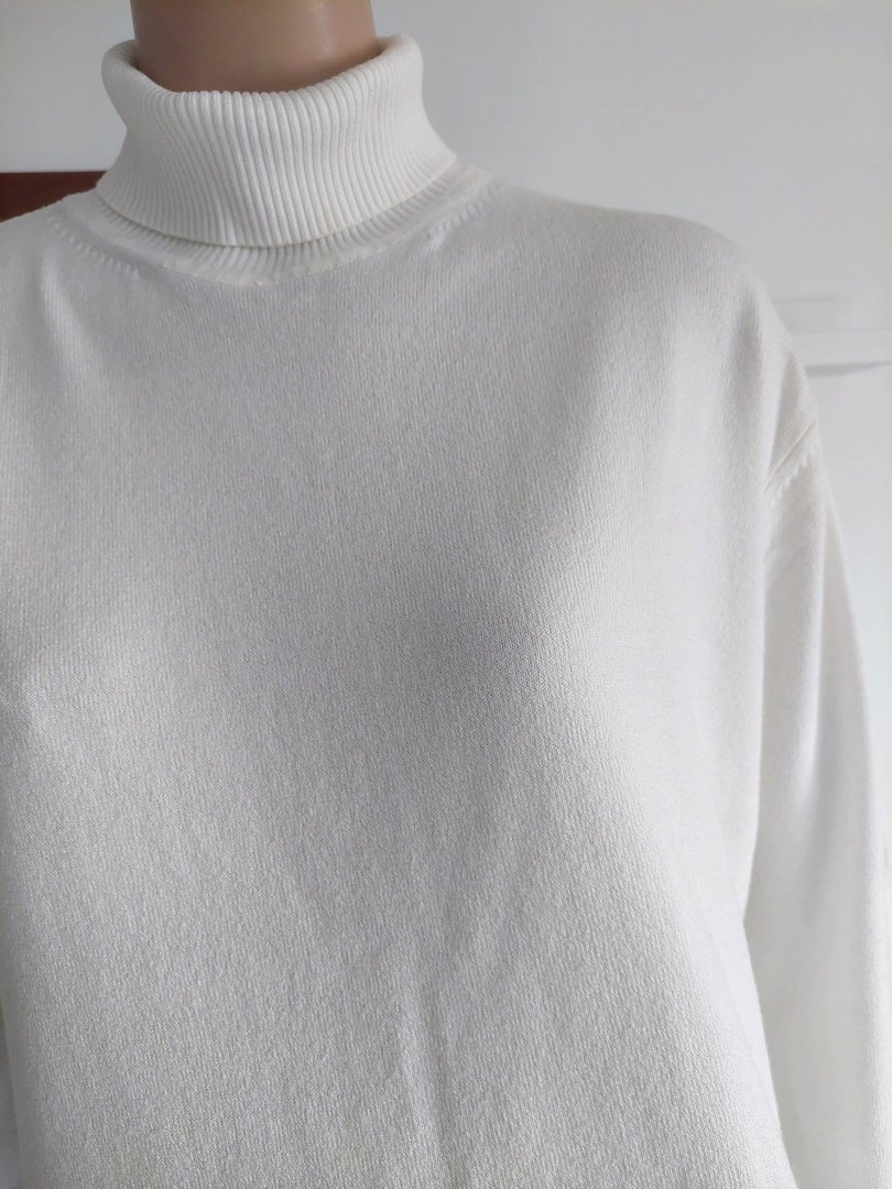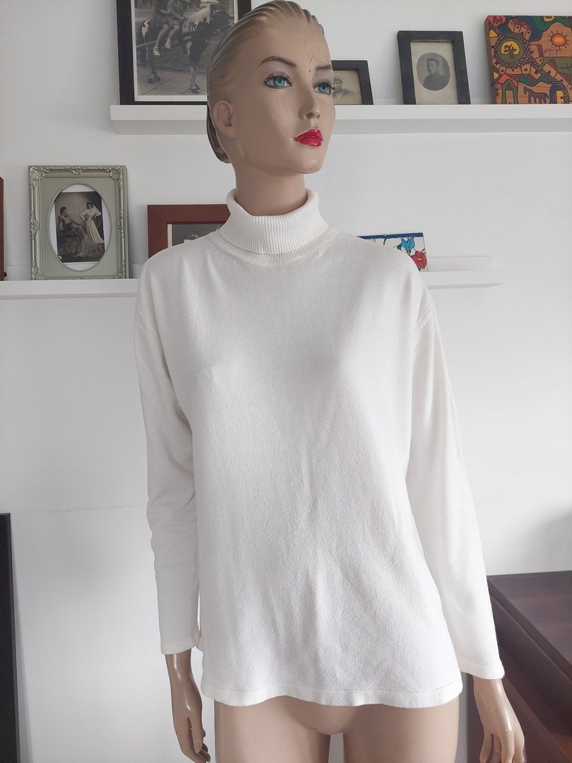 Materiał 65% wiskoza 35% poliamid. rozmiar z metki brak, kolor ecru. Na manekinie o rozmiarze małe 38, stan bardzo dobry. Podaję wymiary mierzone na płasko;