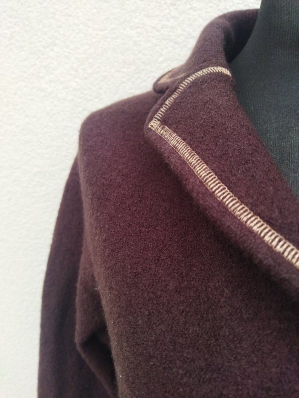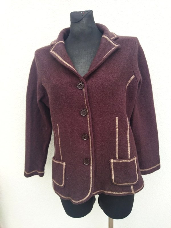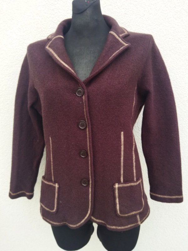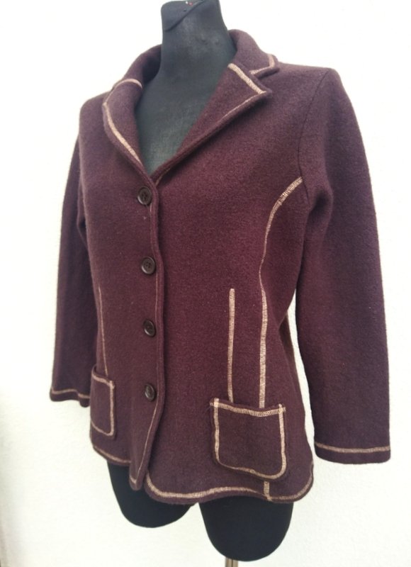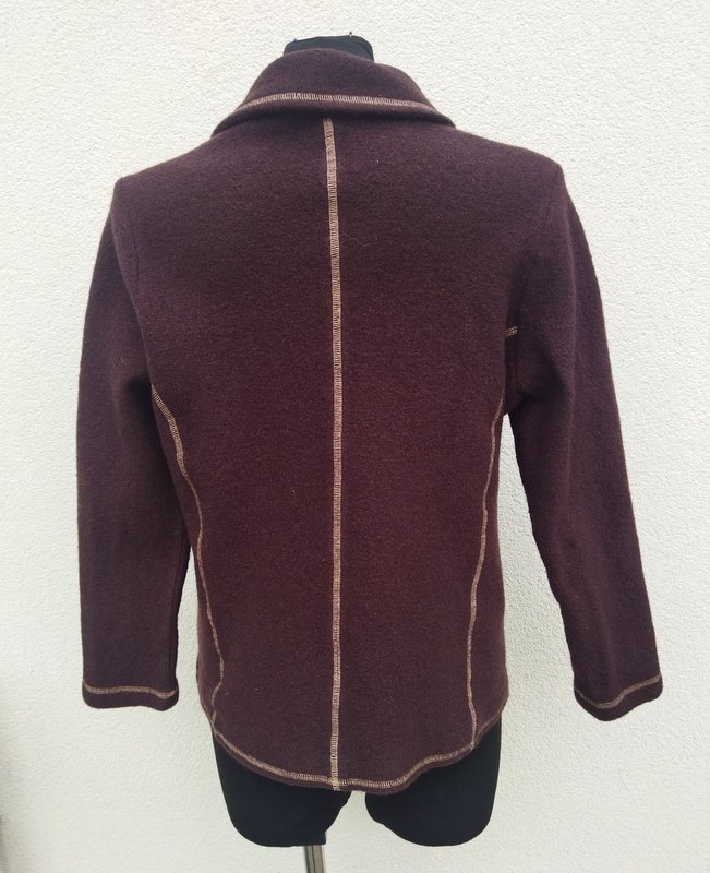 Marynarka z wełnianej tkaniny w kolorze gorzkiej czekolady przeszywana beżowymi nićmi. taliowana z kołnierzem z rewersami , z dwiema naszywanymi kieszonkami. Zapinana na guziki. Bez podszewki.
