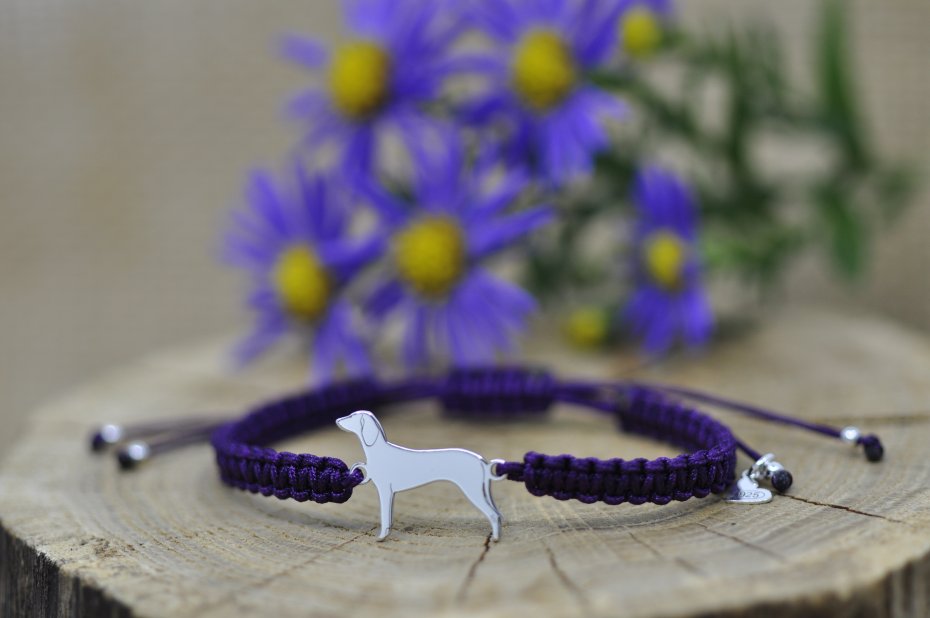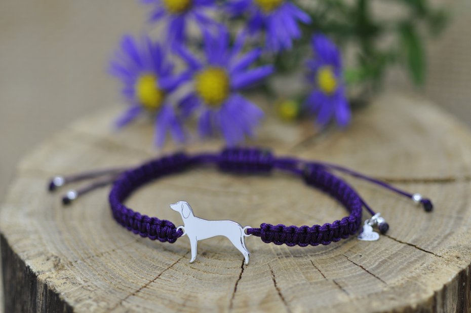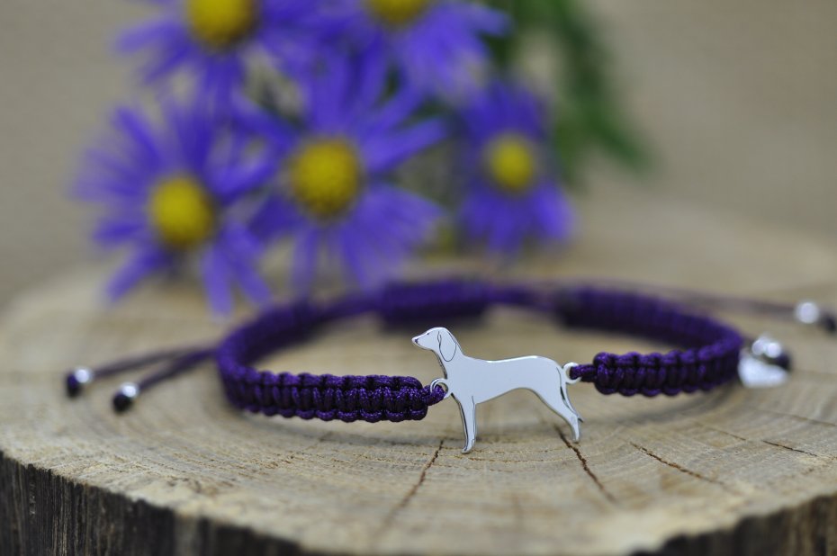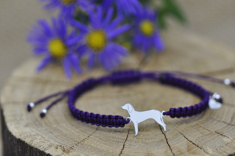 Gończy wykonany ze srebrnej blachy próby 925, wymiary pieska: 19,4 x 15 mm, grubość 0,8 mm oraz srebrne kulki.