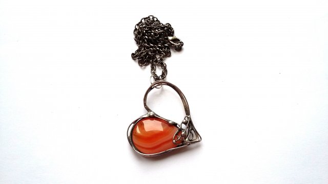 Wisiorek wykonany z miedzi, cyny i agatu. Wymiary ok. 4,5 na 4,5 cm. Łańcuszek o długości ok. 45 cm.