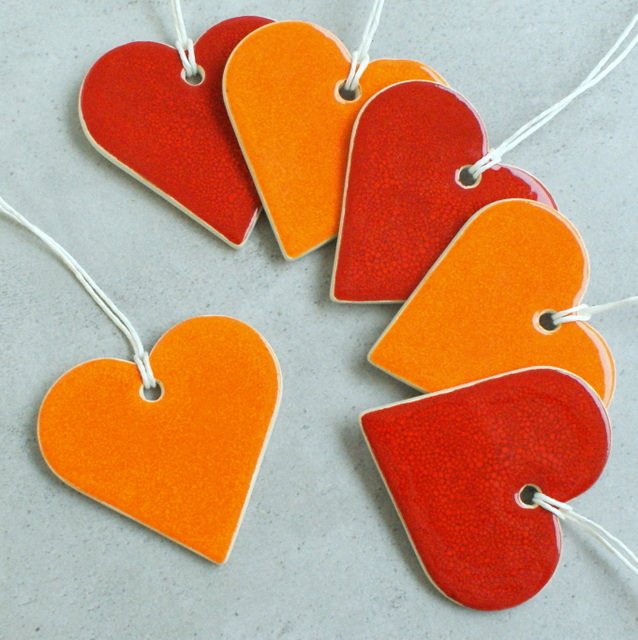 Zestaw 6 ceramicznych zawieszek - serc, bardzo błyszczących. Pokryte szkliwami w soczystych odcieniach czerwieni i pomarańczy. . Wymiary ok. 5,5 cm. Przepiękna ozdoba choinki, stroika albo paczki z prezentem. Ozdobnie opakowane w pudełko, wyściełane siankiem drzewnym i przyozdobione ceramiczną ozdobą. Polecam.
