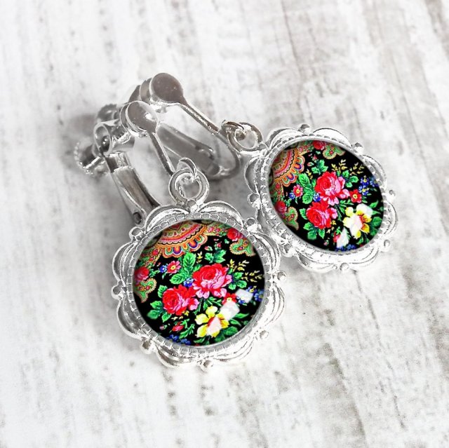 Stylowe, unikatowe, małe wiszące klipsy z oryginalną grafiką artystyczną, zatopioną pod wypukłym szkiełkiem, w oprawie w kolorze srebra. Wypukłość szkła sprawia, że oczko staje się jak trójwymiarowe. Urocze, nieduże, delikatne klipsy. Hipoalergiczne. Zapięcie klipsa jest odchylane, ze specjalnym pokrętłem regulującym docisk do płatka ucha. Szkła z grafiką są unikatowe i ręcznie wykonane, całość wykonana solidnie, z dbałością o detale, dlatego klipsy te są jedyne w swoim rodzaju i niepowtarzalne.