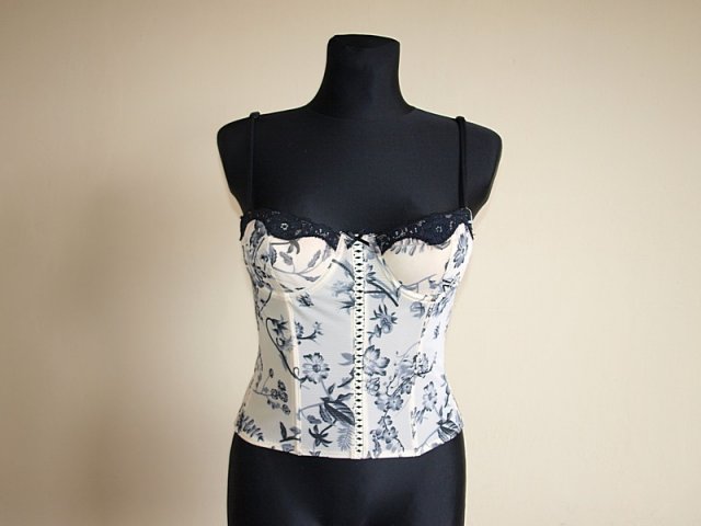 Rozmiar 75B. Materiał to podwójna warstwa delikatnej siateczki. W miseczkach gąbka, z tyłu 3 rzędy haftek. Plecione atłasowe łączenia. Miał papierową metkę , ale niestety urwała się. Mam wrażenie, że na staniku pod koronką jest jakby cień, ale, może to przez gąbkę, która jest pod spodem. Na manekinie o rozmiarze 38. Powinien pasować na rozmiar 36, małe 38.
