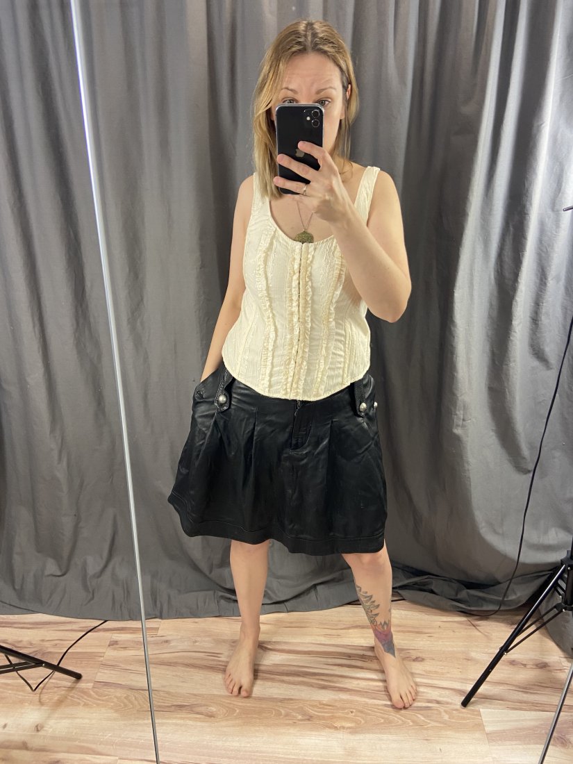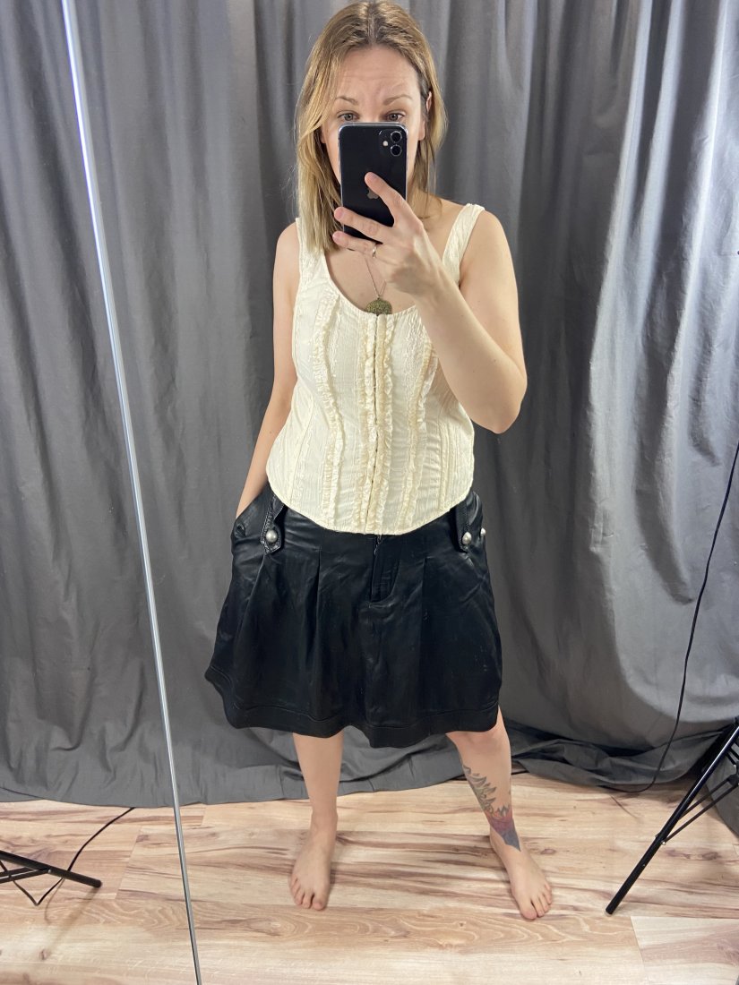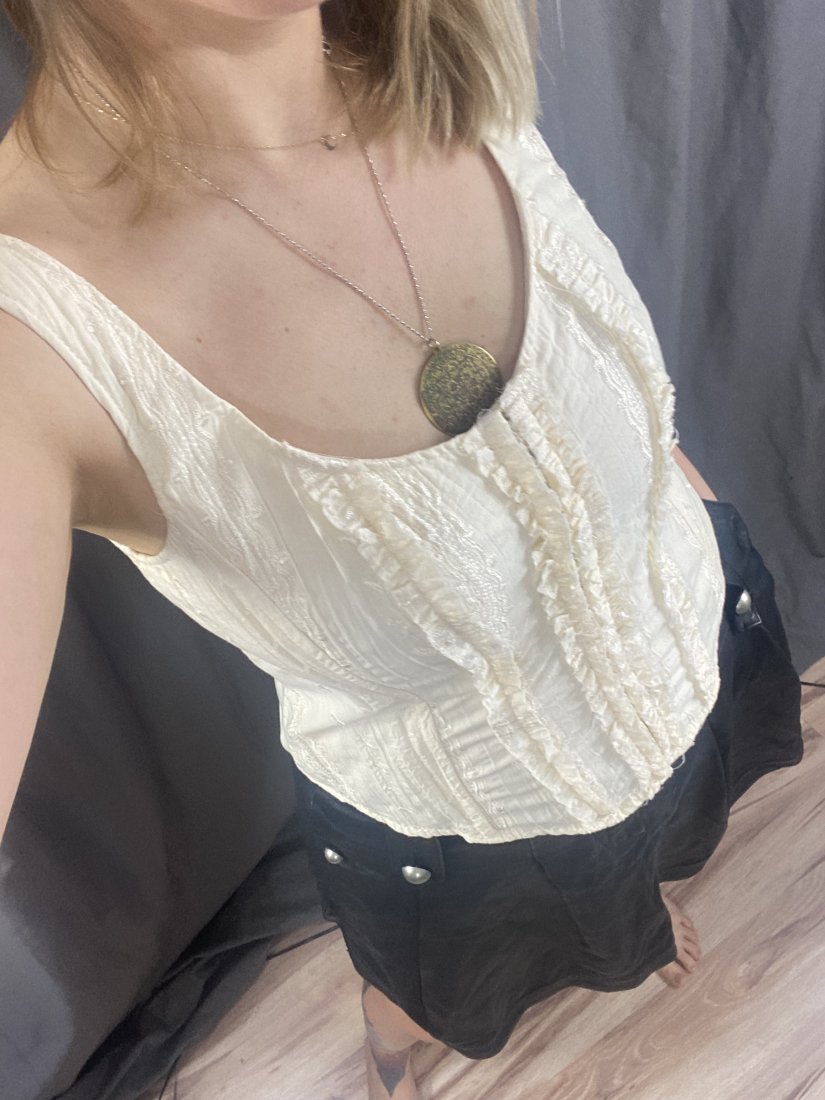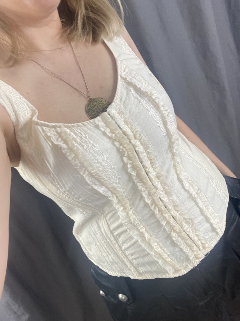 Gorsetowa bluzka z fiszbinami. Przód zapinany na haftki. Materiał: plecy poliester, przód bawełna z elastyną, obszycia poliester z elastyną.