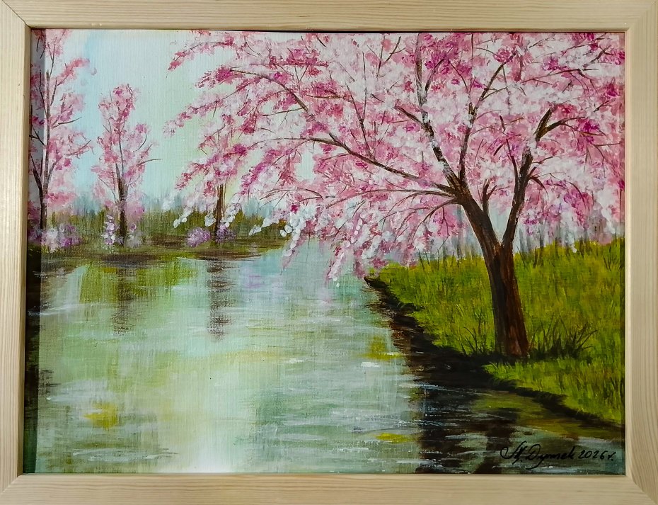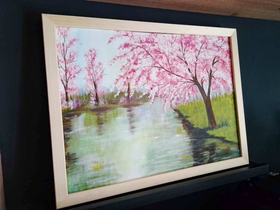 - Tematyka: Niepowtarzalny pejzaż - kwitnąca sakura malowniczo pochylona nad taflą wody