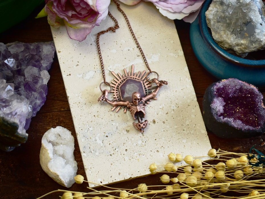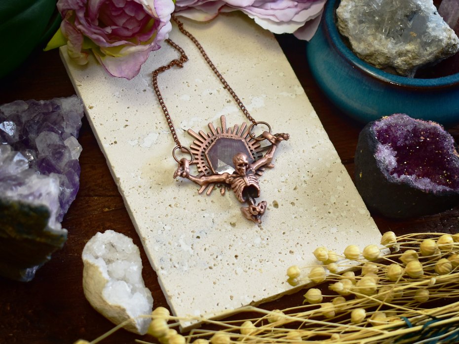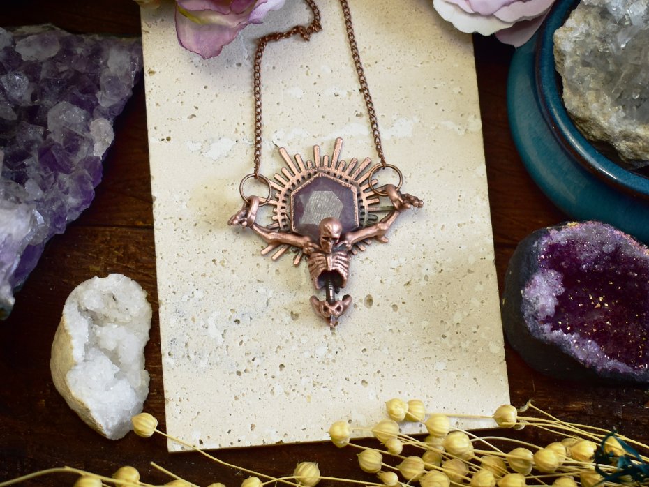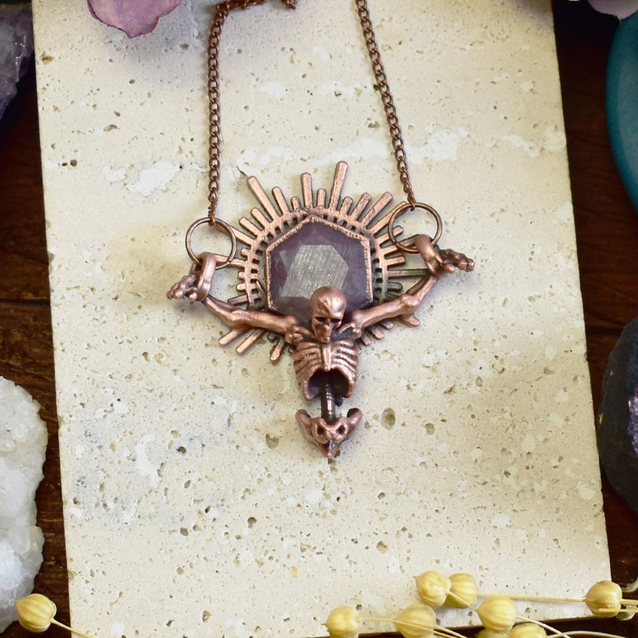 Elektroformowany wisiorek z miedzi o wyrazistym, artystycznym charakterze, przedstawiający ukrzyżowany szkielet. Nad czaszką osadzony został kamień Ruby Star w ozdobnej koronie, układający się w kształt promieni wychodzących zza głowy, co nadaje kompozycji niemal majestatyczny i symboliczny wyraz. Surowość miedzi połączona z precyzyjnym wykonaniem detali podkreśla dramatyzm i ekspresję wisiorka. Całość tworzy odważny, gotycki projekt dla osób ceniących artystyczną, nieoczywistą biżuterię oraz unikatowe połączenia motywów symbolicznych i kamieni szlachetnych.