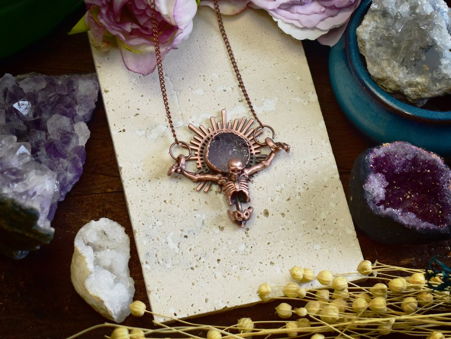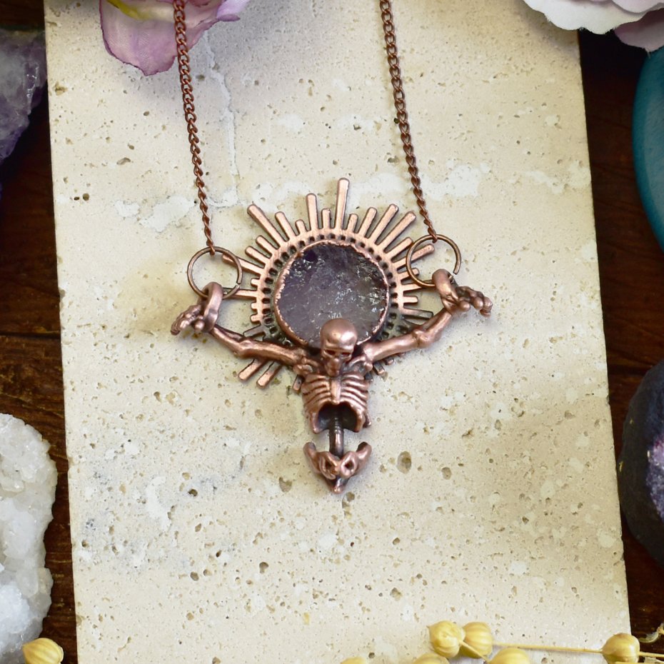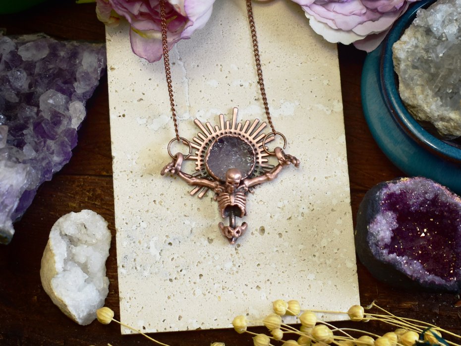 Elektroformowany wisiorek z miedzi o wyrazistym, artystycznym charakterze, przedstawiający ukrzyżowany szkielet. Nad czaszką osadzony został surowy, okrągły ametyst w ozdobnej koronie, którego naturalna struktura i kolor tworzą efekt promieni wychodzących zza głowy, nadając całości symboliczny i niemal mistyczny wyraz. Surowość miedzi w połączeniu z precyzyjnym wykonaniem detali podkreśla dramatyzm i ekspresję wisiorka. To odważny, gotycki projekt dla osób ceniących artystyczną, unikatową biżuterię oraz interesujące zestawienia kamieni szlachetnych i motywów symbolicznych.
