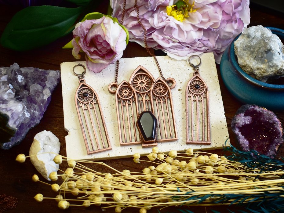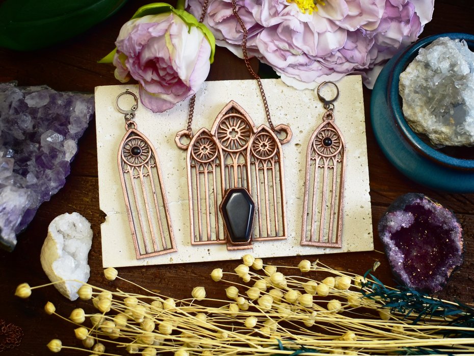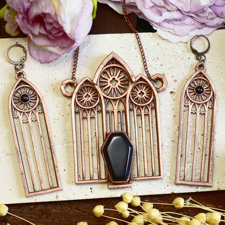 Elegancki zestaw biżuterii z czarnym onyksem, stworzony metodą elektroformowania z miedzi. Kolczyki i wisiorek inspirowane stylem gotyckim i wiktoriańskim oraz architekturą, pełne drobnych detali. Idealny prezent dla niej, doskonały wybór na urodziny, rocznice lub wyjątkową okazję. Każdy element jest unikalny, ręcznie robiony, co czyni go idealnym wyborem dla miłośników mrocznej, eleganckiej biżuterii.