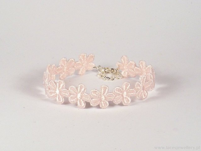 Bransoletka koronkowa w kolorze delikatnego różu. Ręcznie wykonana oraz usztywniona tak aby zachowała odpowiedni kształt i była odporna na zanieczyszczenia, wodę, pot itp. Zapinana jest na łańcuszek. Na życzenia możliwość wykonania modelu w innym rozmiarze. Fantastyczna ozdoba na co dzień. Bransoletka obecna także w kolorze błękitnym oraz cytrynowym.