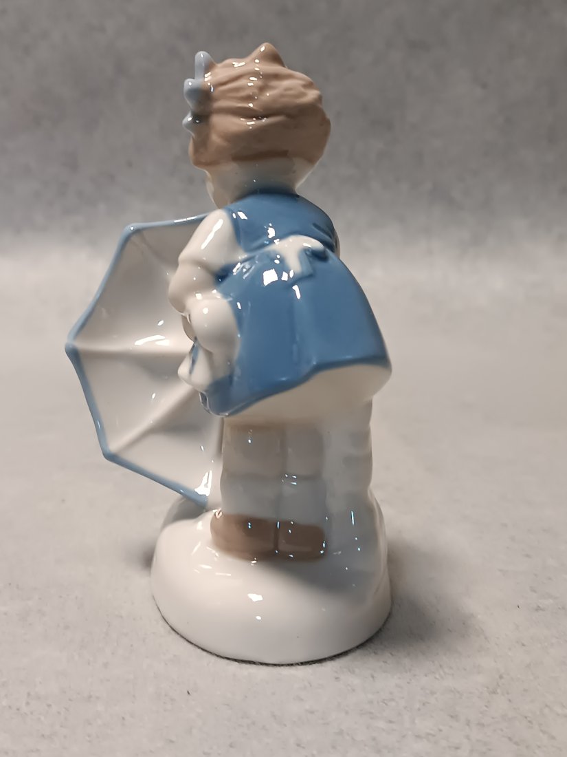 Dominujące kolory to biel i różne odcienie niebieskiego, z subtelnymi akcentami w różowych i brązowych odcieniach skóry. Styl figurki jest realistyczny, ale z elementami stylizacji, charakterystyczny dla klasycznych figurek porcelanowych o tematyce dziecięcej i zwierzęcej.