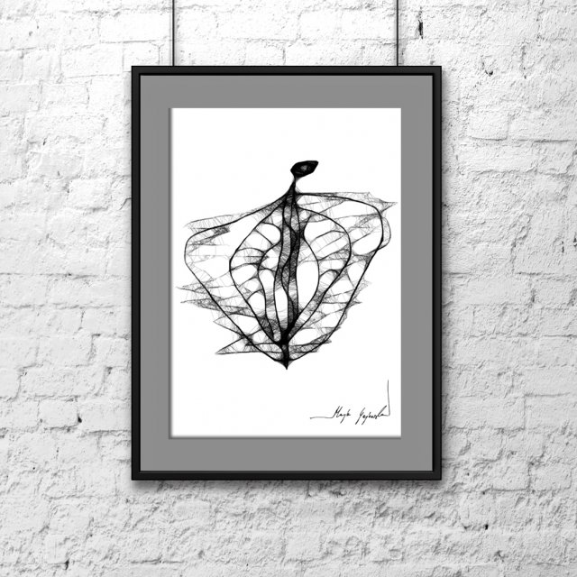 Grafika wykonana techniką mieszaną na papierze białym FABRIANO. Format A4. Grafika jest oprawiona - czarna, satynowa, aluminiowa rama oraz grafitowe passe partout.