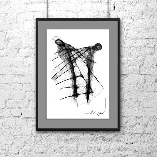 Grafika wykonana techniką mieszaną na papierze białym FABRIANO. Format A4. Grafika jest oprawiona - czarna, satynowa, aluminiowa rama oraz grafitowe passe partout.