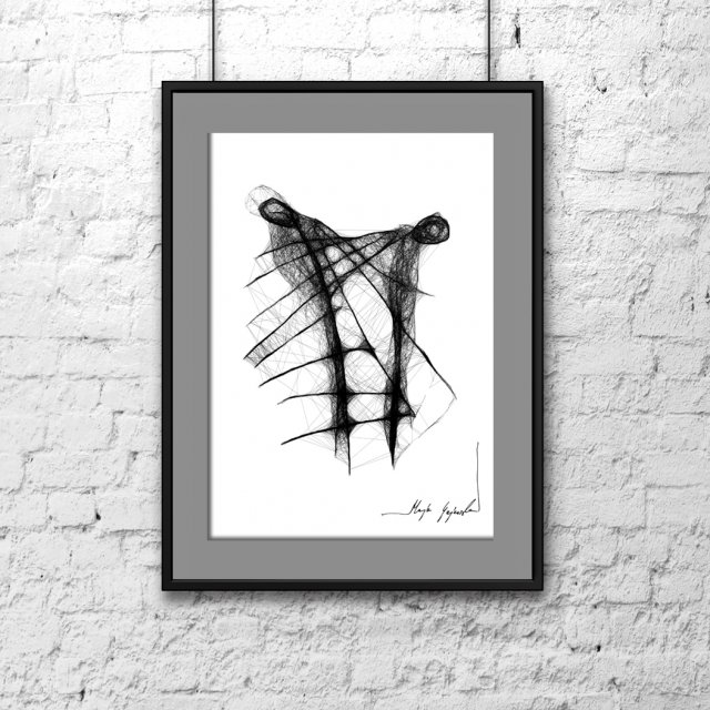Grafika wykonana techniką mieszaną na białym, matowym o lekko fakturowanej powierzchni, graficznym papierze Canson 160g. Gwarancja jakości w czasie długotrwałego przechowywania. Format 40x30 cm. Praca jest oprawiona - czarna, aluminiowa, satynowa rama oraz grafitowe passe partout. Gotowa do powieszenia na ścianie.