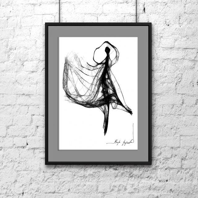 Grafika wykonana techniką mieszaną na papierze białym FABRIANO. Format A4. Grafika jest oprawiona - czarna, satynowa, aluminiowa rama oraz grafitowe passe partout.