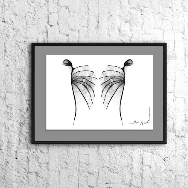 Grafika wykonana techniką mieszaną na białym, matowym o lekko fakturowanej powierzchni, graficznym papierze Canson 160g. Gwarancja jakości w czasie długotrwałego przechowywania. Format 30x21 cm. Praca jest oprawiona - czarna, aluminiowa, satynowa rama oraz grafitowe passe partout. Gotowa do powieszenia na ścianie.