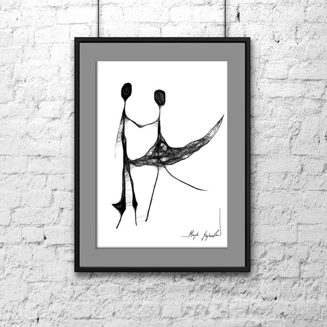 Grafika wykonana techniką mieszaną na białym, matowym o lekko fakturowanej powierzchni, graficznym papierze Canson 160g. Gwarancja jakości w czasie długotrwałego przechowywania. Format 40x30 cm. Praca jest oprawiona - czarna, aluminiowa, satynowa rama oraz grafitowe passe partout. Gotowa do powieszenia na ścianie.
