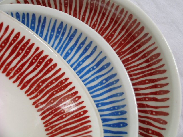 Porcelanowy zestaw filiżanki i dwóch spodków z ciekawym zdobieniem i w wyrazistych kolorach. Na błyszcząco szkliwiony. Sygnowany Lettin. Filiżanka: średn. 10,5; szer. 13; wys. 6 cm. Spodki: 14,5 x 1,5 cm. Stan zachowania bardzo dobry.