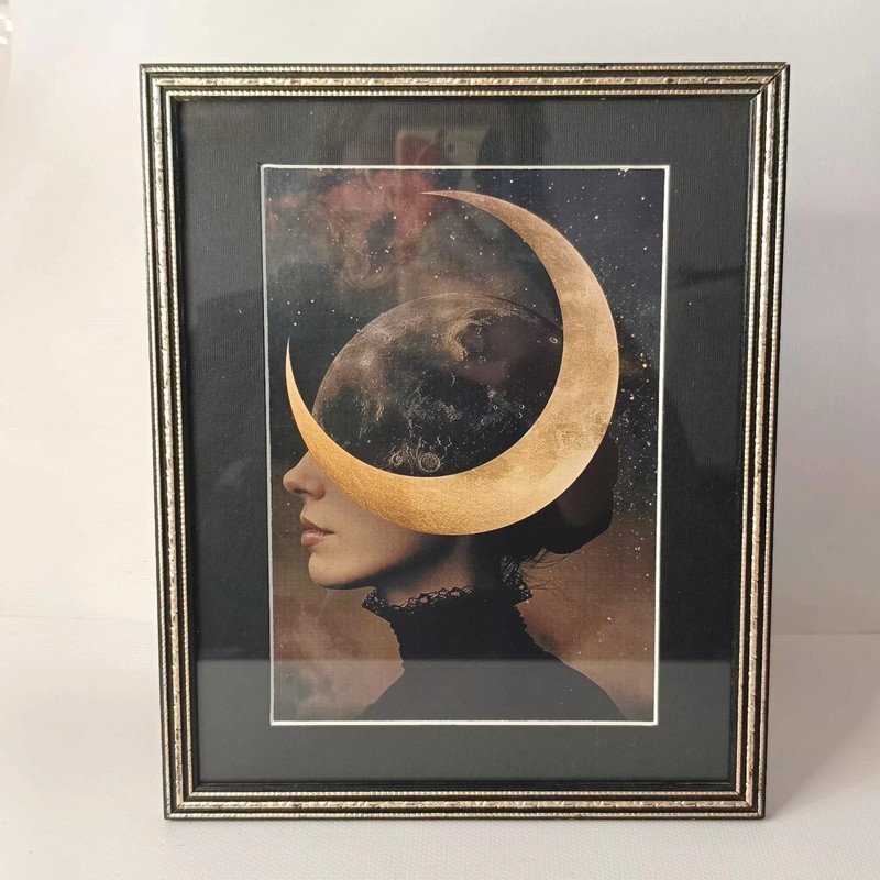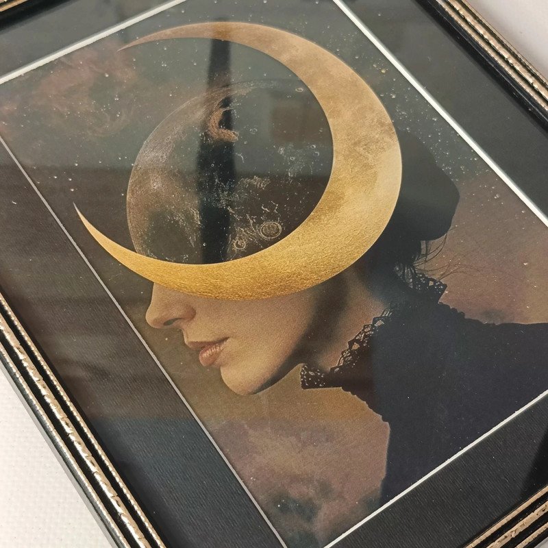 Niepowtarzalny obrazek w ramce "Księżycowa dama". Ramka pochodzi z rynku wtórnego, grafika oraz paspartu są nowe. Ramka drewniana w stanie dobrym, szklana "szybka".