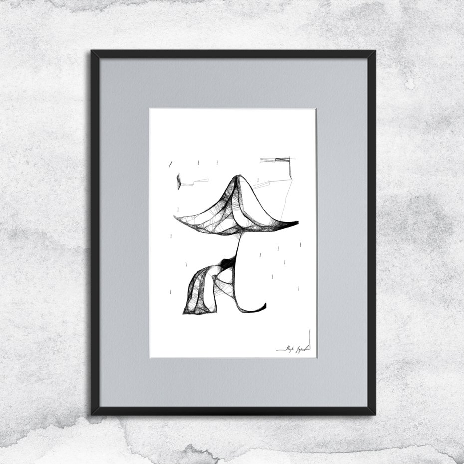 Grafika wykonana techniką mieszaną (giclée oraz rysunek isografem) na białym, matowym o lekko fakturowanej powierzchni, graficznym papierze Canson 250g. Unikalna kreska wygląda bardzo efektownie, zaś czarno-białe wykończenia wnętrz idealnie wpisują się w puste ściany nowoczesnych, minimalistycznych czy loftowych powierzchni.