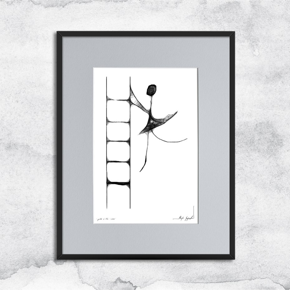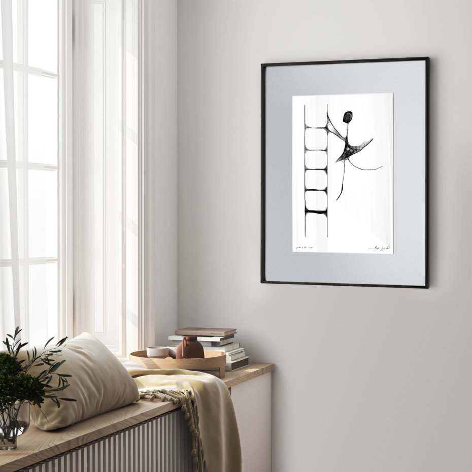 Grafika wykonana techniką mieszaną (giclée oraz rysunek isografem) na białym, matowym o lekko fakturowanej powierzchni, graficznym papierze Canson 250g. Unikalna kreska wygląda bardzo efektownie, zaś czarno-białe wykończenia wnętrz idealnie wpisują się w puste ściany nowoczesnych, minimalistycznych czy loftowych powierzchni.