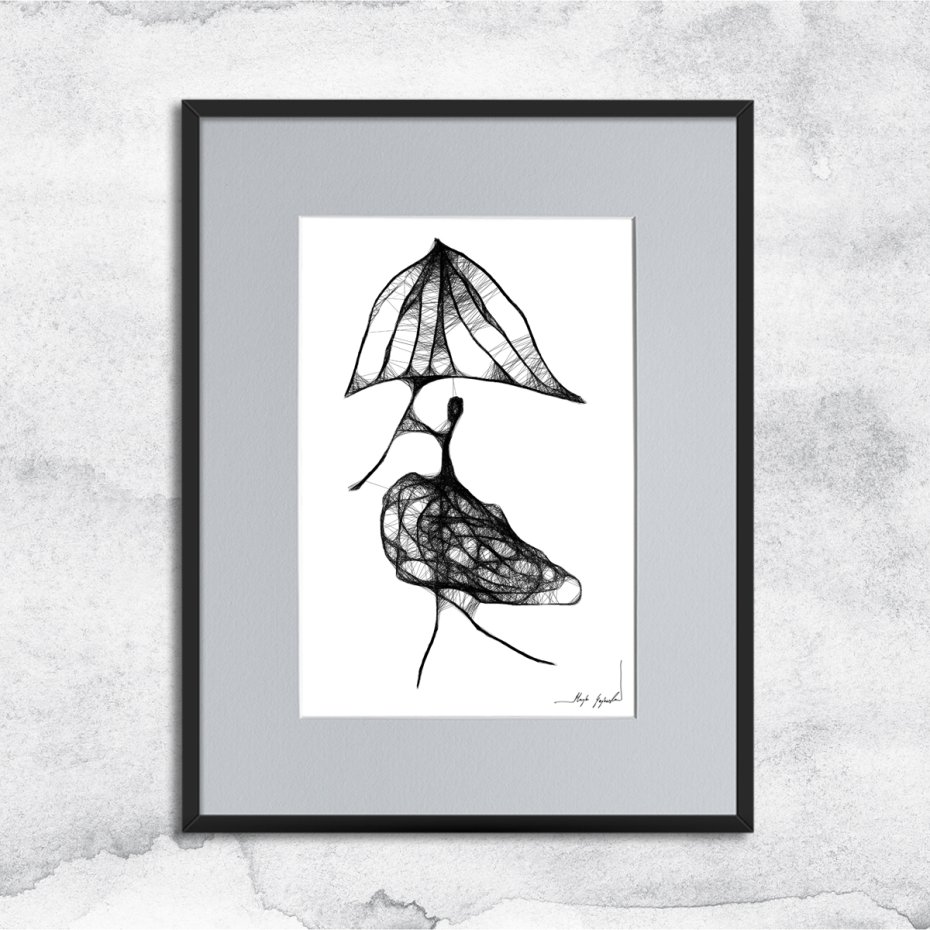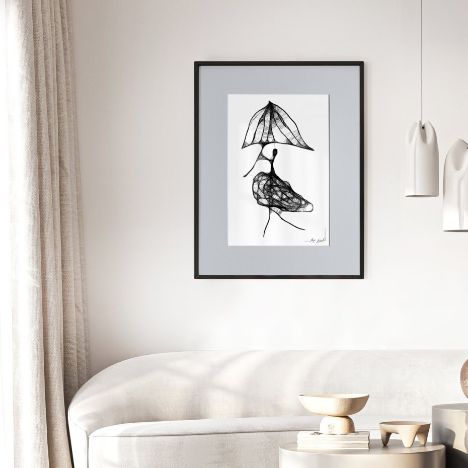 Grafika wykonana techniką mieszaną (giclée oraz rysunek isografem) na białym, matowym o lekko fakturowanej powierzchni, graficznym papierze Canson 250g. Unikalna kreska wygląda bardzo efektownie, zaś czarno-białe wykończenia wnętrz idealnie wpisują się w puste ściany nowoczesnych, minimalistycznych czy loftowych powierzchni.