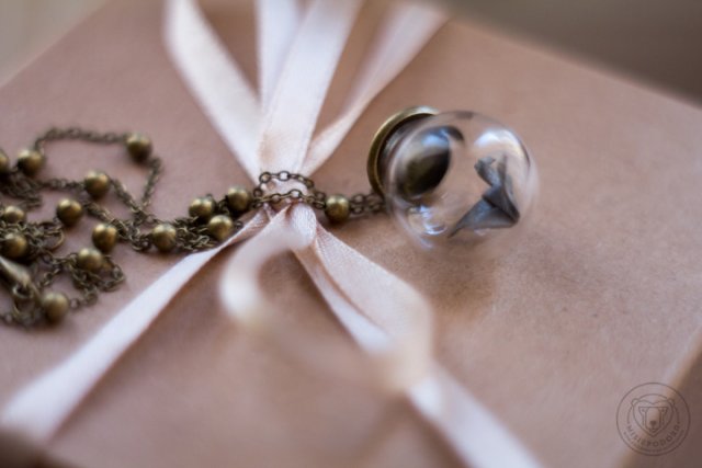 Delikatny, maleńki, papierowy żuraw - japoński symbol szczęścia, zdrowia i pokoju. Podobno, jeśli w jakiejś intencji złoży się tysiąc żurawich figurek, to życzenie się spełni. My spełniamy życzenia tym zjawiskowym wisiorkiem. Papierowy żuraw ukryty w szklanej kuleczce o najszerszej średnicy 2 cm. Część ozdobna zawieszona na łańcuszku o długości 37 cm. Całość w kolorze starego złota/brązu.