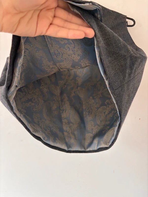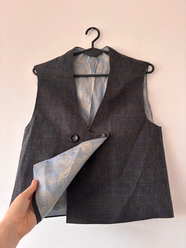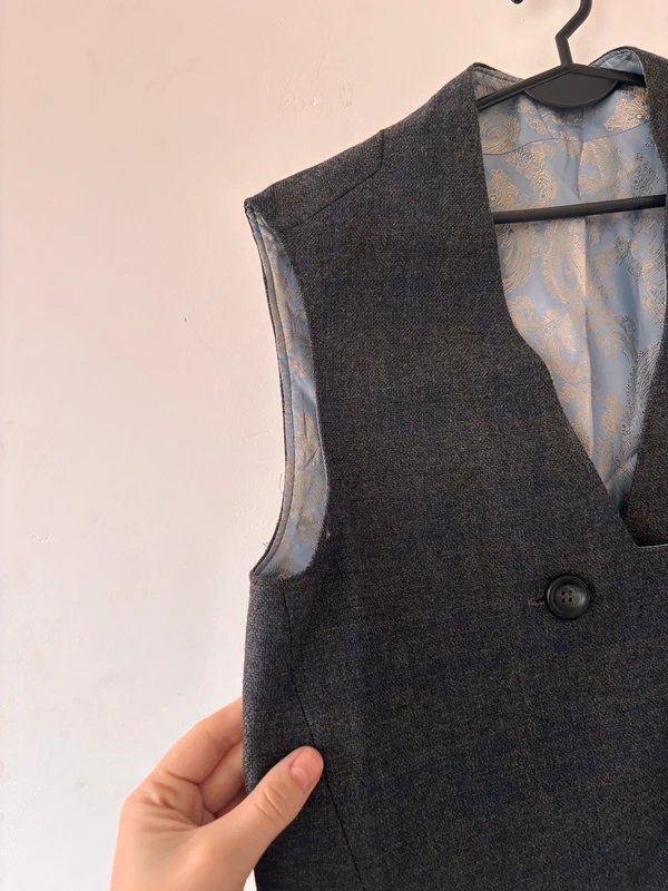 Klasyczna szara kamizelka o eleganckim kroju, zapinana na dwa guziki z przodu. W środku posiada piękną, żakardową podszewkę w stylu retro, która dodaje charakteru i jakości.Sprawdzi się w looku vintage, old money, a także jako element smart casual.