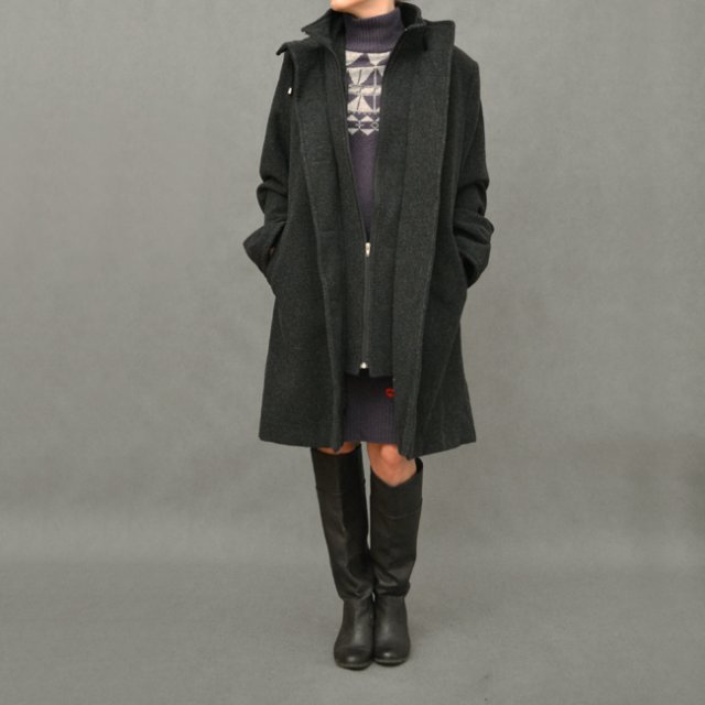 Świetna grafitowa kurtka-płaszczyk wykonana z 80% z wełny. Z kapturem, kieszonkami po bokach i zameczkami na dole. Bardzo ciekawie jest zapinana. Najpierw zapina się ją na zamek i dopóki nie zapnie się na guziki, to po bokach odstają dwie jakby plisy (zdjęcie pierwsze), co bardzo fajnie wygląda i można nosić na różne sposoby. Polecam.