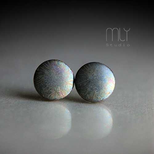 Ceramiczne kolczyki w formie sztyftów, ręcznie wykonane z delikatnej gliny kamionkowej, jednostronnie szkliwione mieszanką szarobłękitnych szkliw z efektem plamek, na antyalergicznych sztyftach w kolorze srebrnym.Średnica ok. 9mm.. Polecam