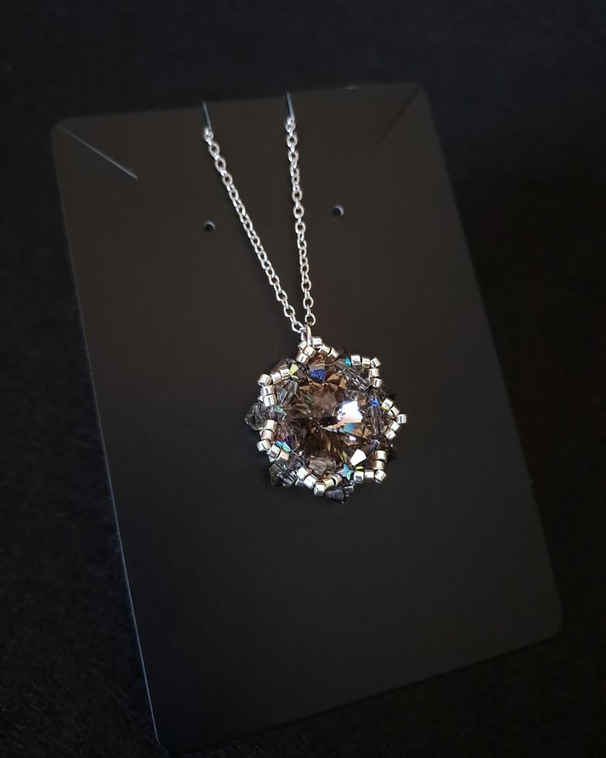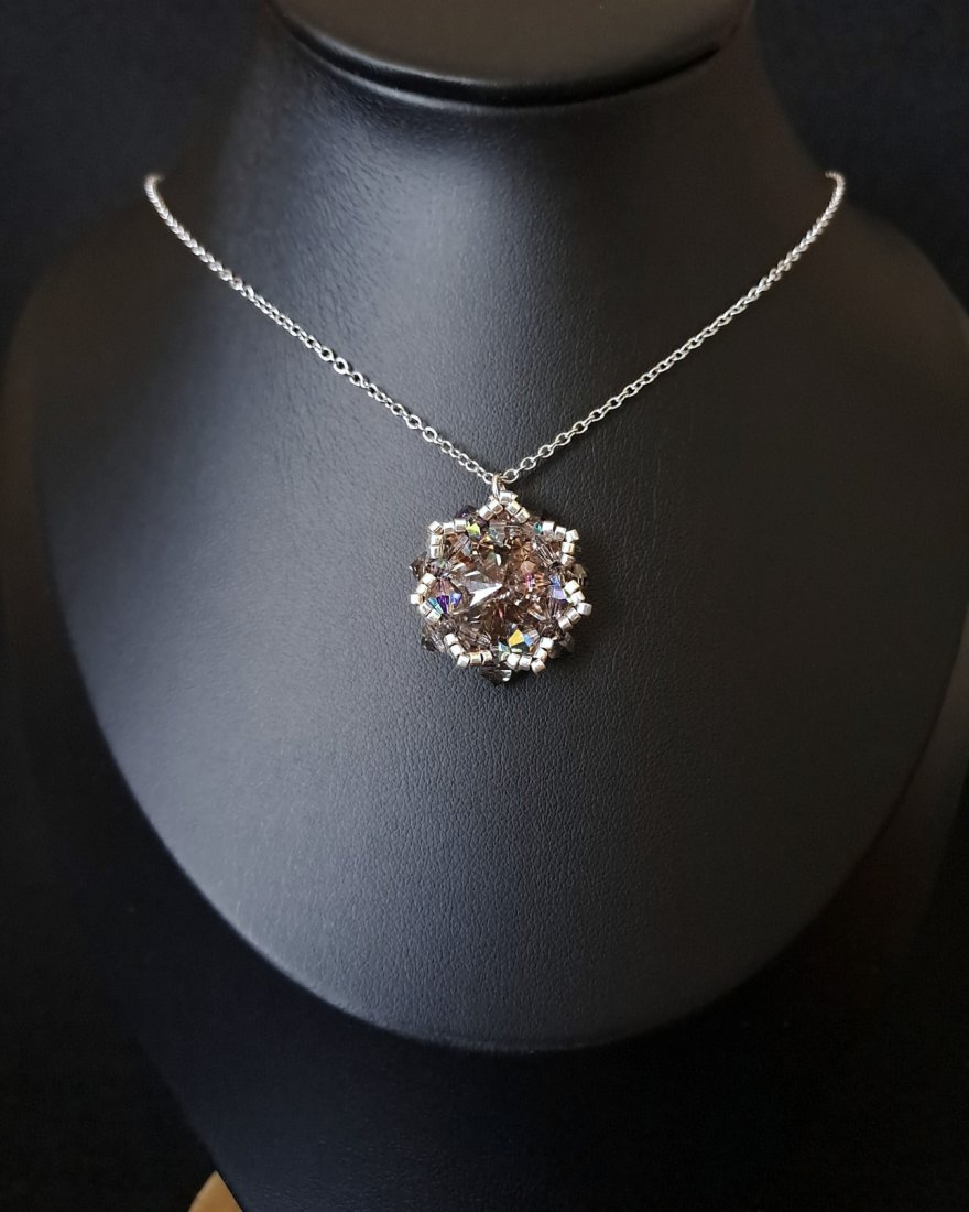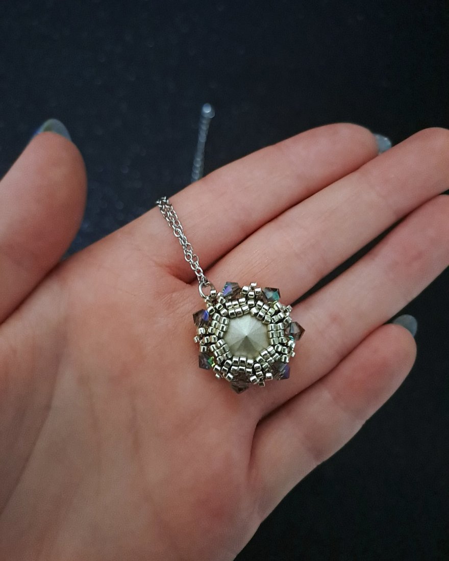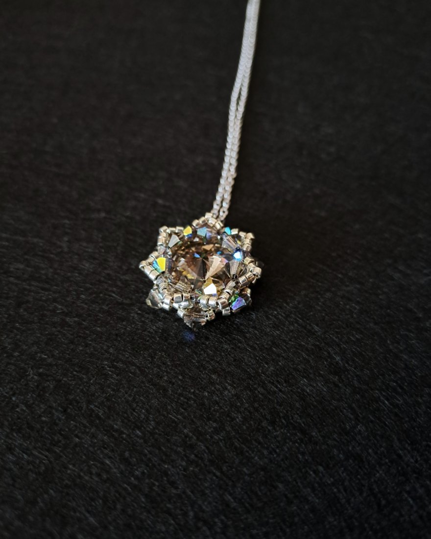 – Materiały: kryształ Preciosa Crystal Maxima 14 mm, kryształki Preciosa Bicone 3 mm i 4 mm, koraliki Miyuki Delica, stal nierdzewna