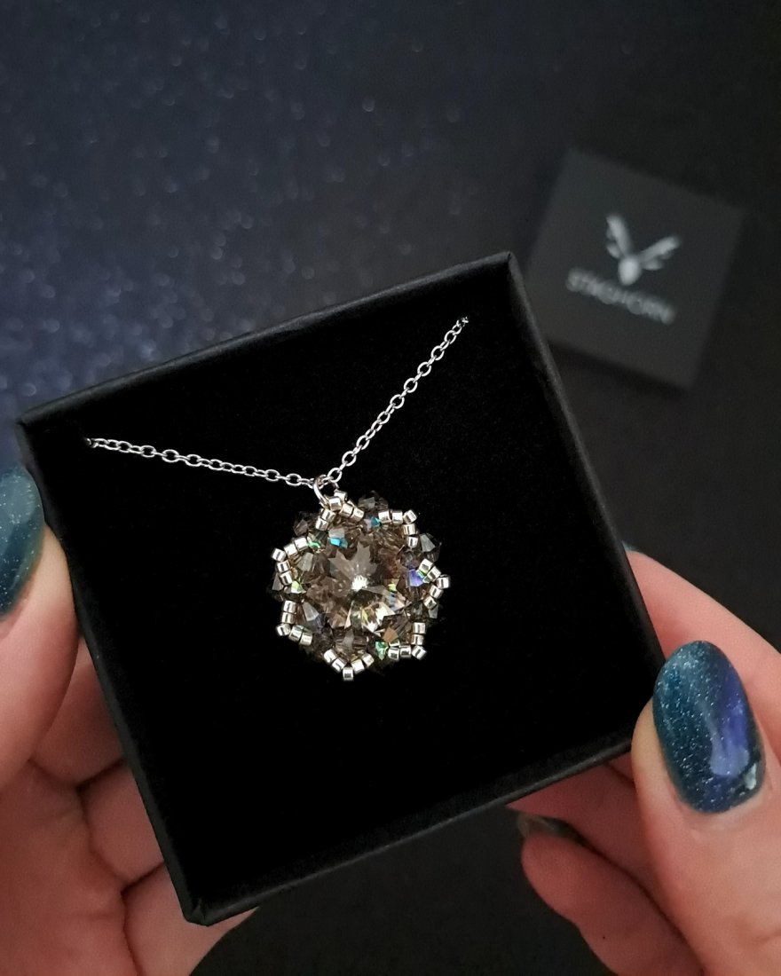 Centralny kryształ Preciosa Crystal Maxima w odcieniu Black Diamond przyciąga wzrok głębokim, grafitowo-srebrzystym blaskiem, który odbija światło niczym nocne niebo przed burzą. Otoczony koralikami Miyuki i drobnymi kryształkami Preciosa Bicone tworzy zawieszkę, która wygląda jak mały fragment gwiezdnej konstelacji.