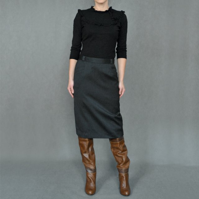 Piękna spódnica w grafitowym kolorze. Krój ołówkowy. Na podszewce. Zapinana na zamek i guzik z tyły. Po bokach kieszonki.