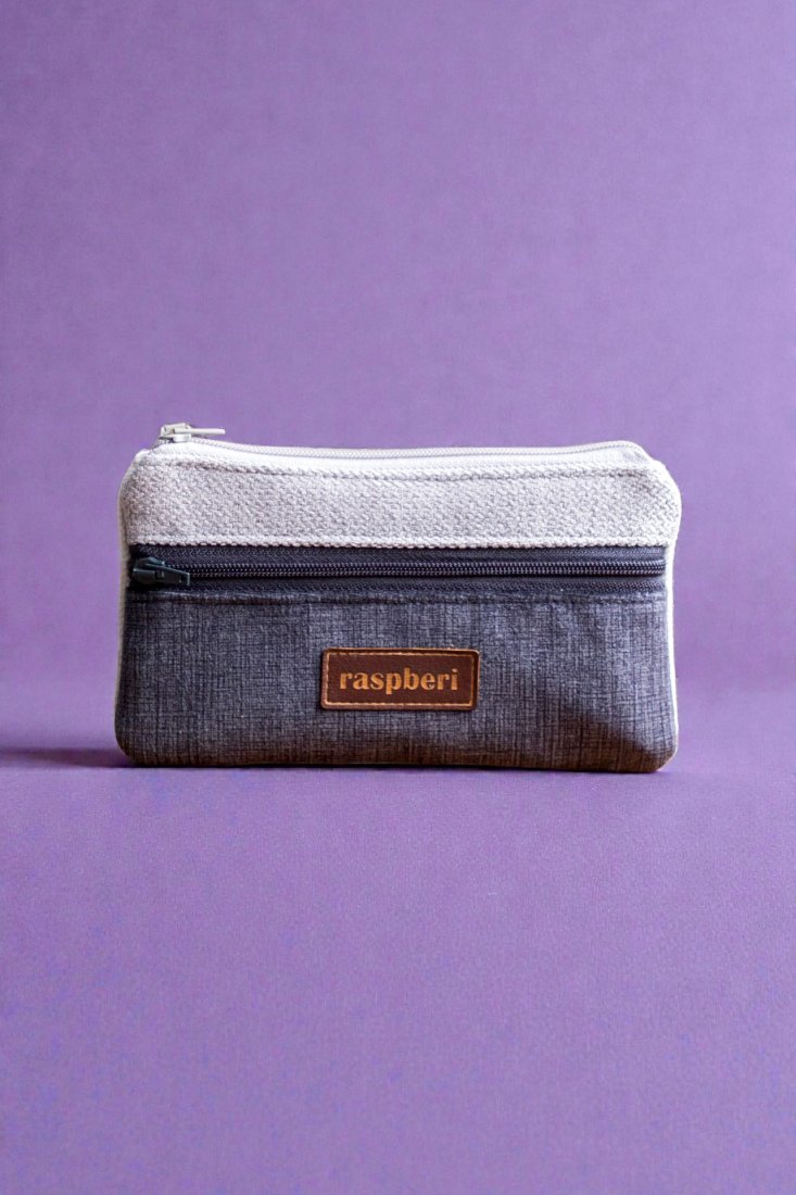 Prosty wodoodporny portfel wykonany z kilku rodzajów tkanin w odcieniach szarości.