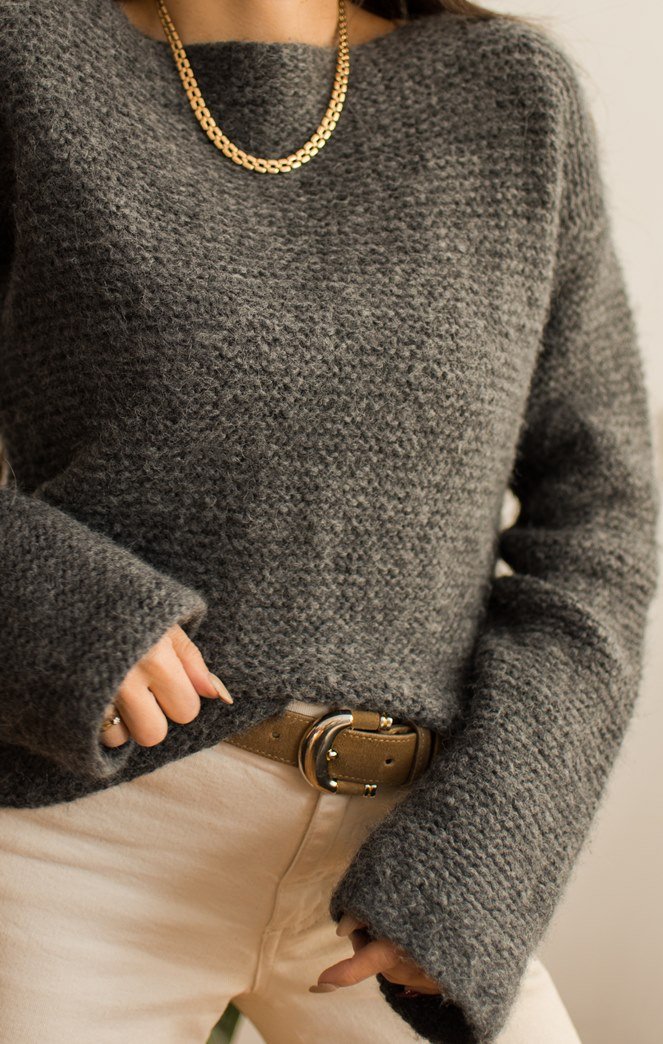 Wełniany grafitowy sweter z szerokimi rękawami, robiony na drutach.