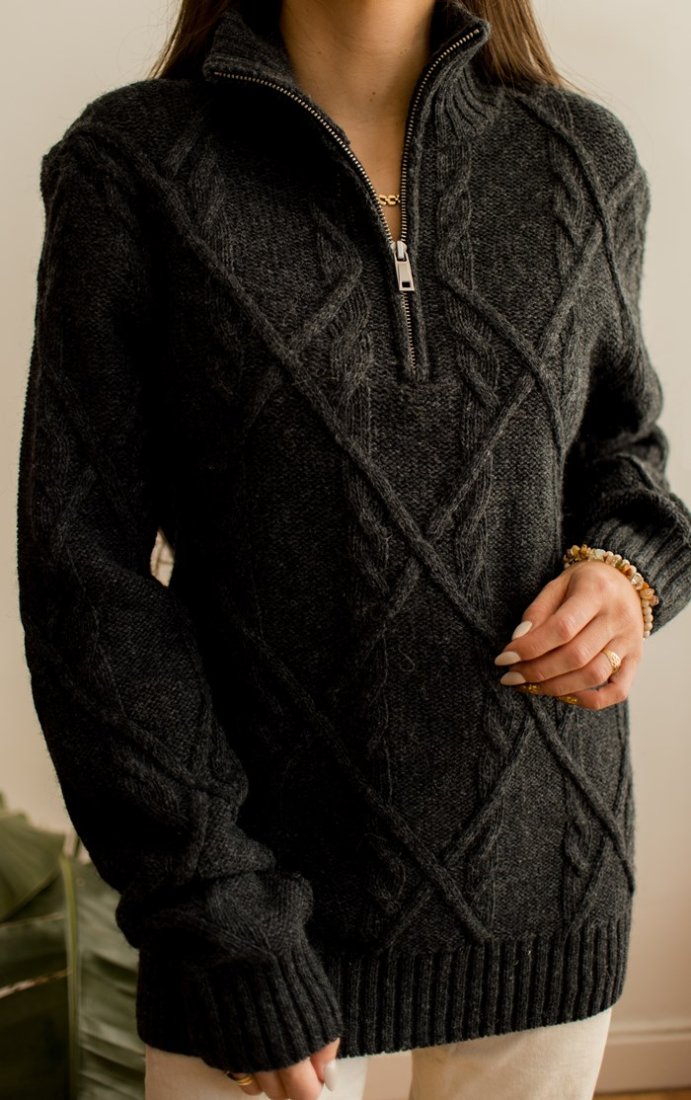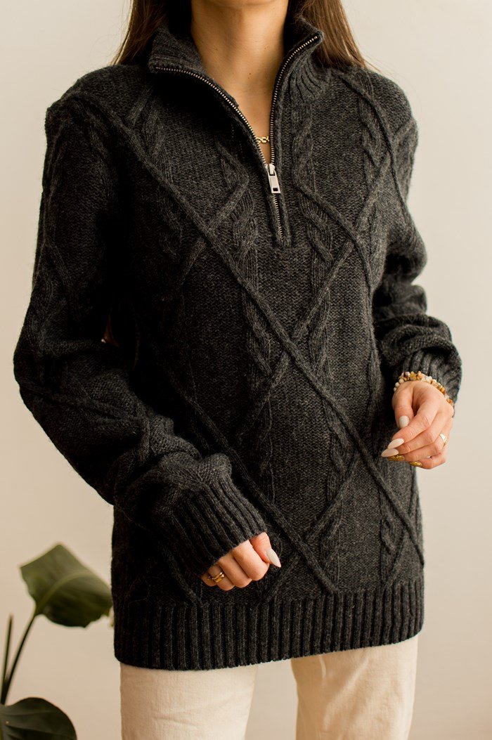 Grafitowy męski sweter z wełną. Fajnie wygląda również na sylwetce damskiej.
