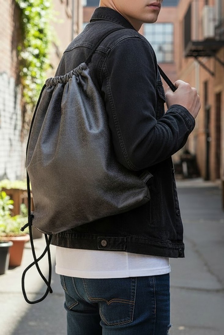 Plecak worek wykonany z grafitowej miękkiej ekoskóry.