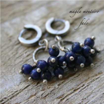 Kamienie: kuleczki przepięknego lapis lazuli z pirytem ( 0,4 cm ) zawieszone na srebrnym owalu. Bigle kajdanki. Długość