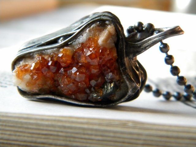 naszyjnik. kryształy spessartynu w ocynowanej miedzi. wymiary zawieszki 4,1cm x 2,3cm. piękny okaz kamienia - pochodzenie Chiny. łańcuszek z oksydowanej stali -50cm. unikat