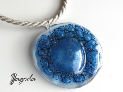 Bardzo efektowny duży szklany wisior o średnicy ok. 5cm. Wisior zawieszony na naturalnym sznurku o długości ok. 50cm.