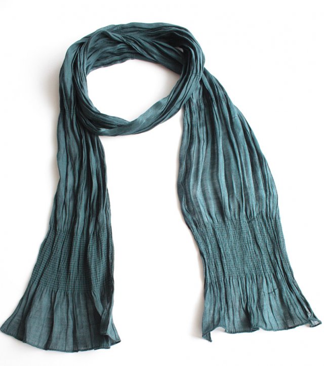 Szal w odcieniu granatu z nutą zieleni. Miejscami marszczenia. Wykonany prawdopodobnie z poliestru.