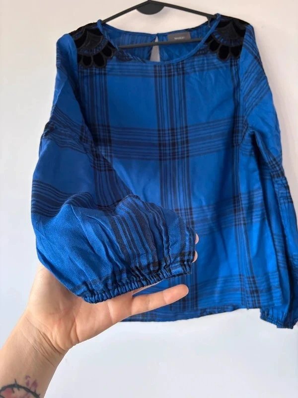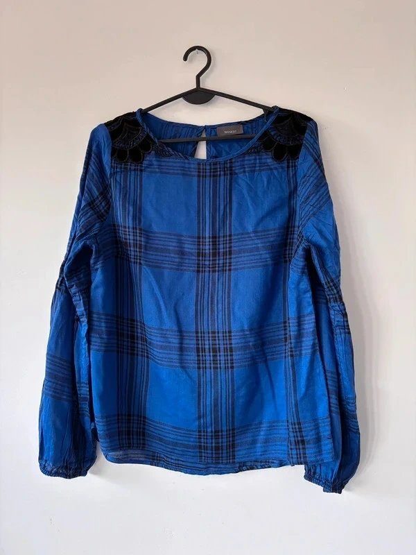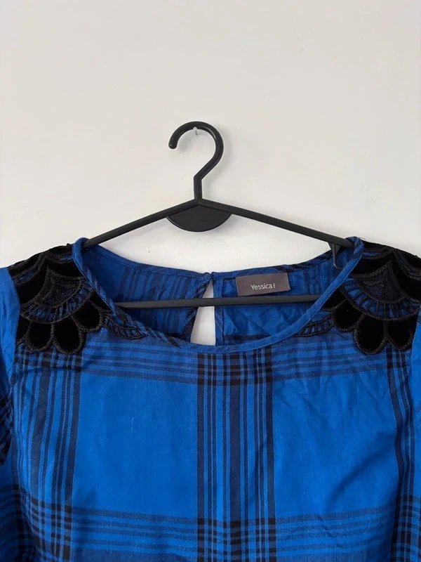 Bluzka damska w intensywnym niebieskim kolorze, zdobiona czarną kratką i eleganckim haftem na ramionach. Posiada prosty, lekko oversize’owy krój, długi rękaw zakończony gumką oraz okrągły dekolt z zapięciem na guziczek z tyłu. Tkanina lekka i przyjemna