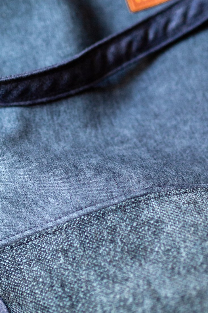 Średniej wielkości torebka w stylu boho. Worek zapinany na suwak z okrągłym, usztywnianym dnem wykonany z granatowej tkaniny. Granatowe paski.