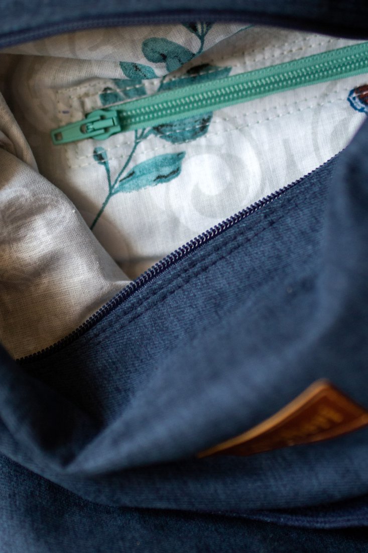 Torebka w środku oraz z tyłu posiada kieszonki zapinane na suwak. Biała, bawełniana podszewka w kwiatki.