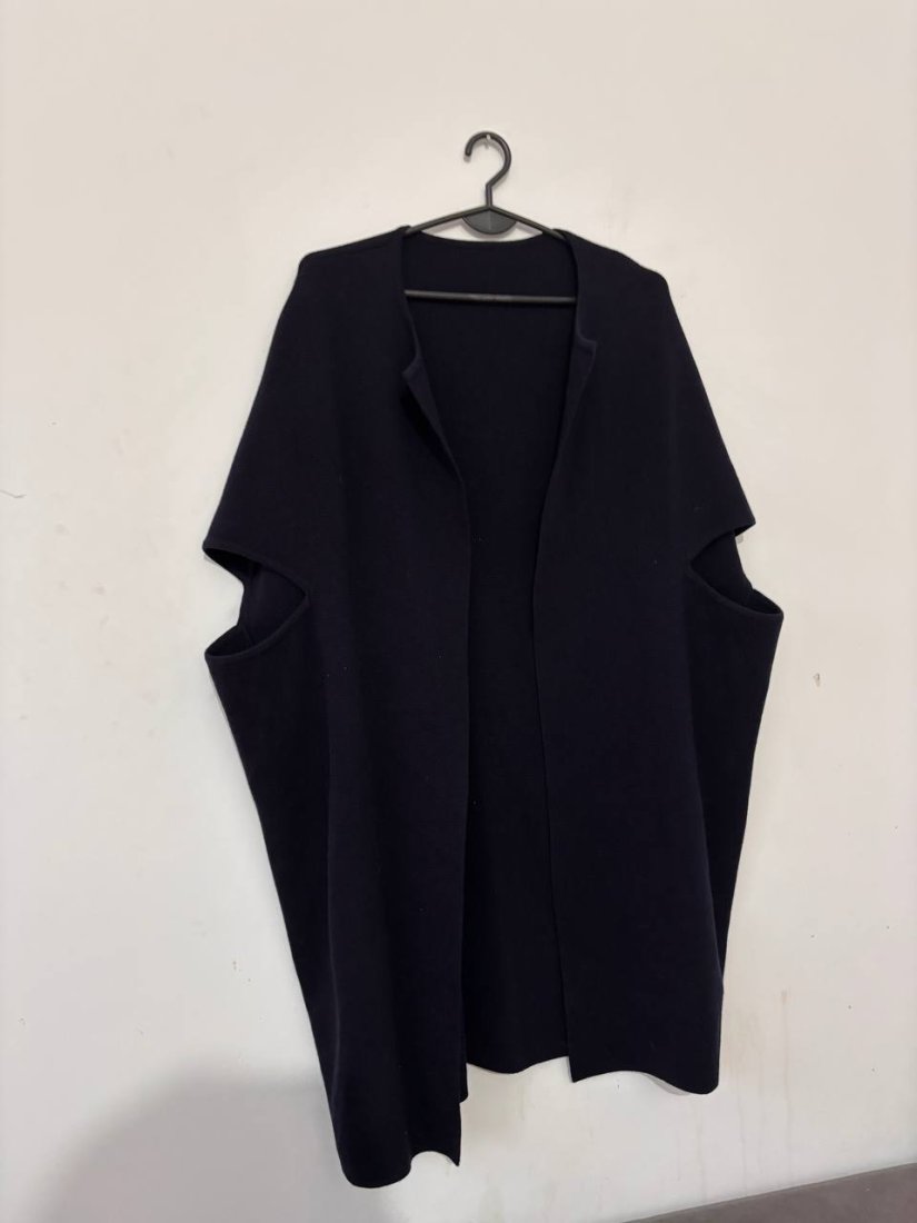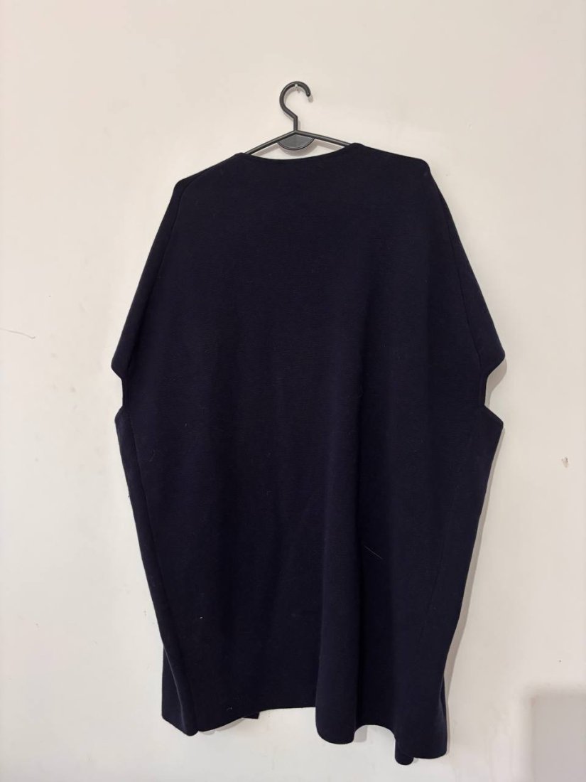 Granatowa, oversize’owa kamizelka wykonana z wysokiej jakości mieszanki 55% wełny merynosowej i 45% bawełny. Miękka, przyjemna w dotyku, pięknie układa się na sylwetce.