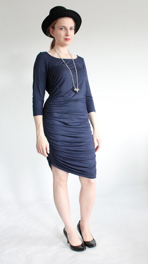 Granatowa, dopasowana sukienka drapowana na bokach przy pomocy gumek.