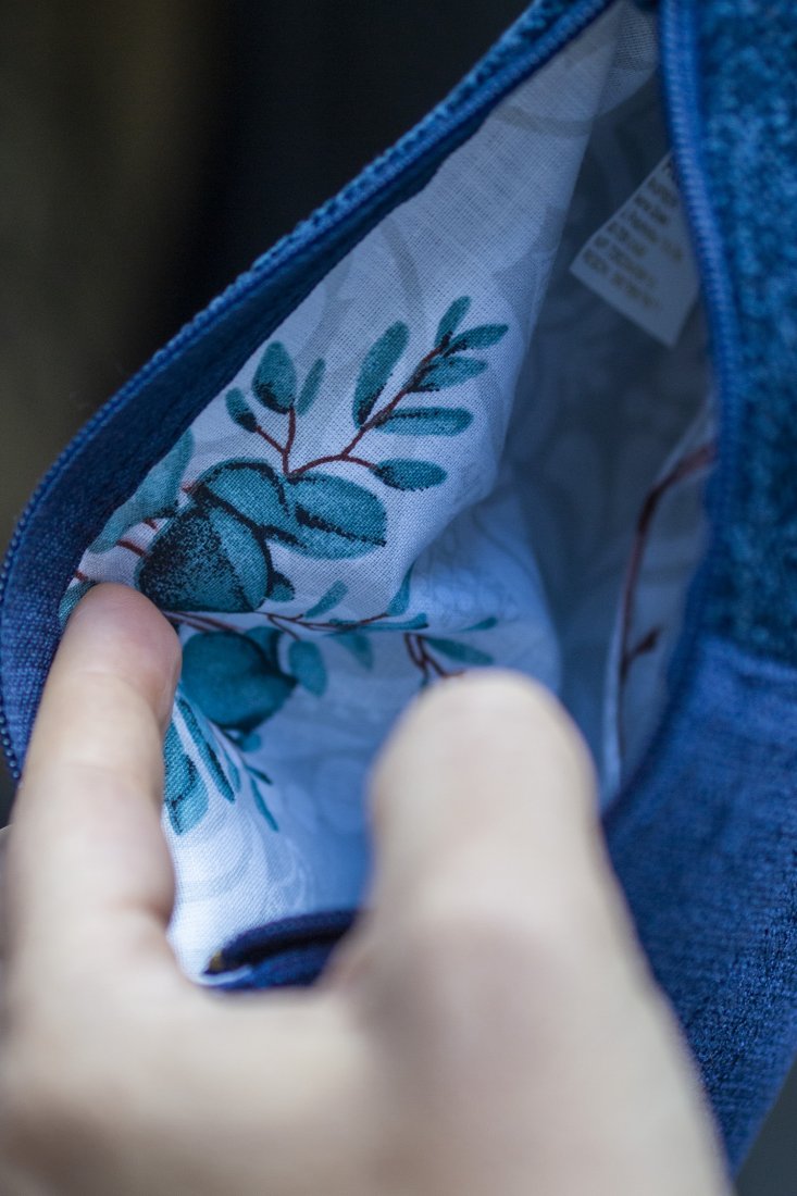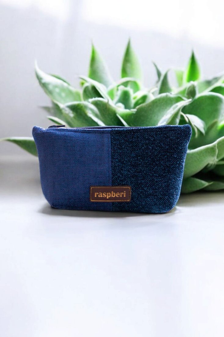 Średniej wielkości kosmetyczka wykonana z dwóch rodzajów tkanin w kolorze granatowym.