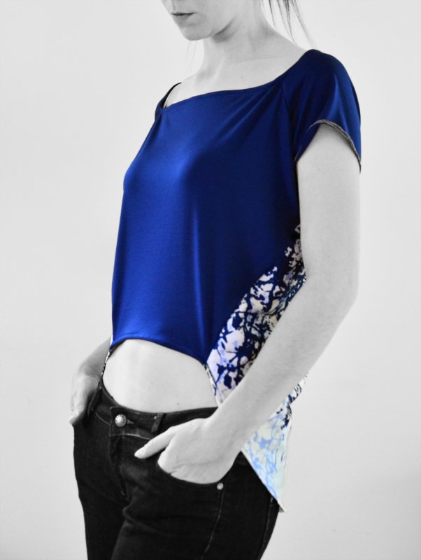 Koszulka wykonana została z cienkiej granatowej dzianiny, plecy z pięknego materiału w granatowo-niebieski ciapki. Prosty krój, tył zdecydowanie dłuższy od przodu. Rozmiar M