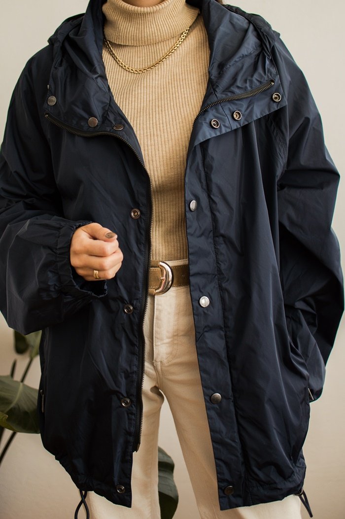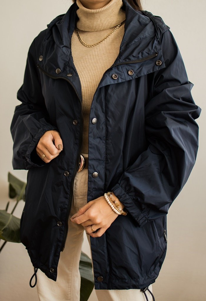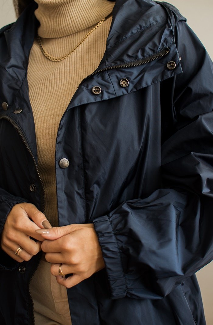 Granatowa kurtka przeciwdeszczowa, z kapturem.