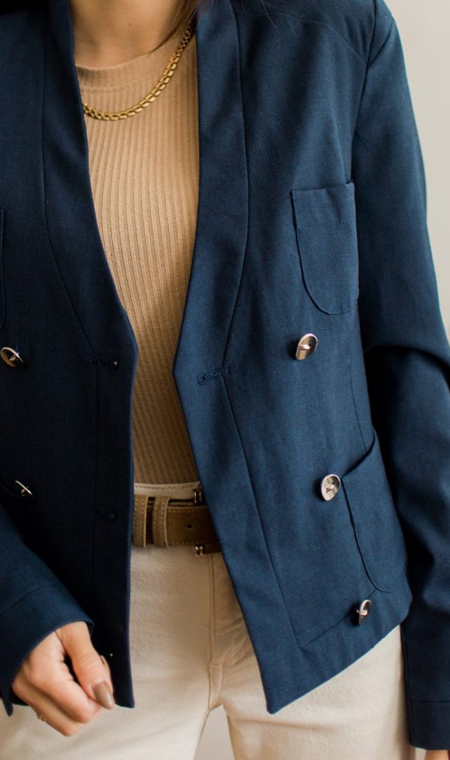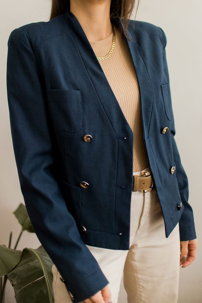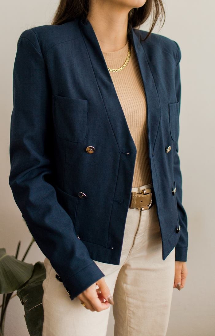 Granatowa marynarka ze srebrnymi guzikami i poduszkami na ramionach.