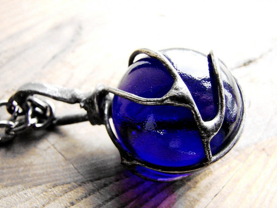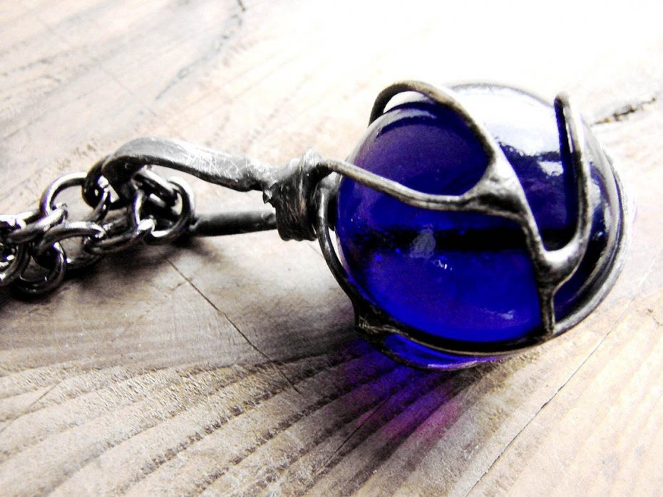 Antyczny wisior wykonany z cynowanej miedzi oraz szklanej kuli śerednicy 25 mm lutowany stopem cyny i srebra. Całość patynowana na kolor starego srebra ręcznie przecierana i polerowana , zawieszona na 60 cm łańcuszku. Jeśli życzą sobie Państwo inną dowolną długość łańcuszka proszę o informacje mailową po zakupie a bez problemu to zmienię. Wymiary wisiora to 2,7 x 5.5 cm. Zapraszam do zakupu ...